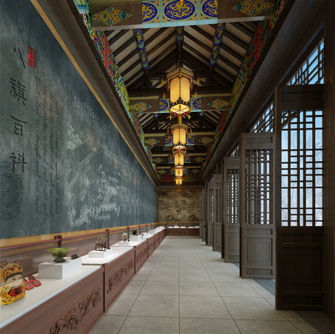 方案設計摒棄原來單一以“展廳”形式為主的流陳,增加了多處場景還原,真實再現當年八旗子弟生活工作的場面。此案在設計上巧妙的把滿族文化融入到生活場景中,如“滿族萬字坑”“清代閨房”“神桿”等,再輔以古色古香的墻面石刻與展柜,在有限的空間內盡可能完整全面的呈現八旗文化。