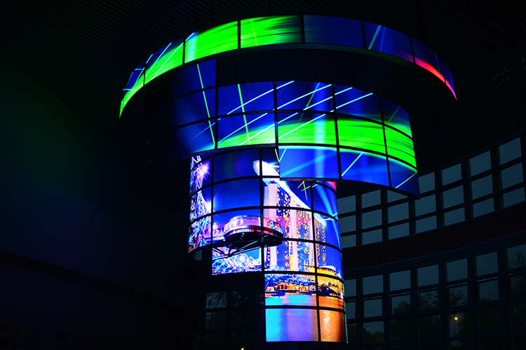 國(guó)內(nèi)首個(gè)OLED曲面拼接雕塑懸掛在挑高三層的展廳中央,給產(chǎn)業(yè)園帶來(lái)了非比尋常的震撼視覺。