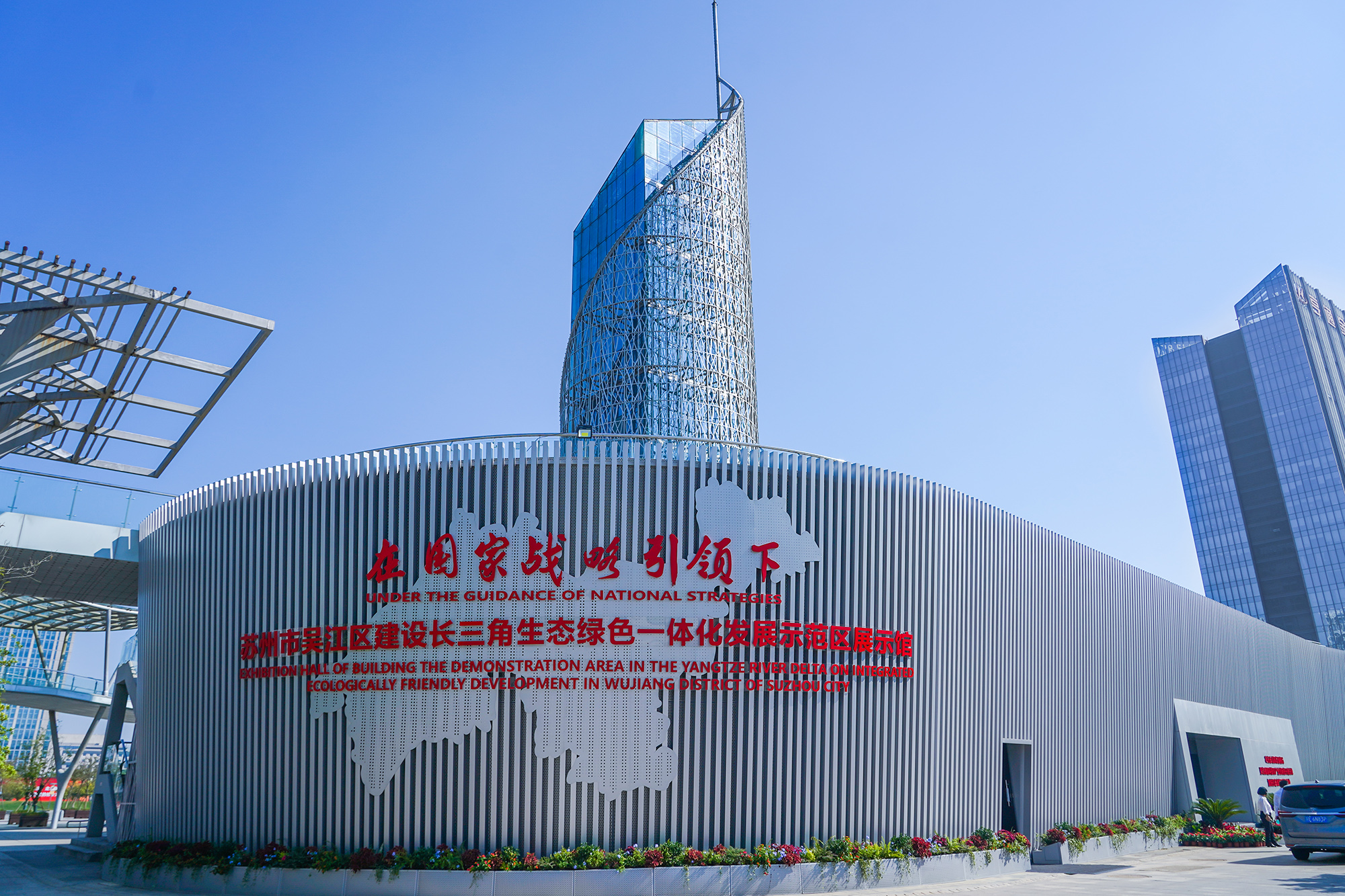 蘇州市吳江區建設長三角生態綠色一體化發展示范區展示館全景展示了長三角一體化發展戰略提出以來,吳江地區的堅決貫徹與生動實踐。