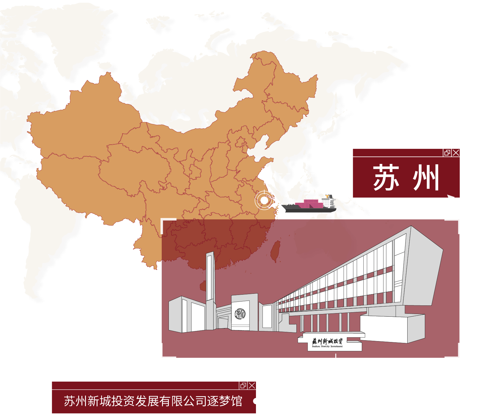 一輛輛貨車有序駛過 窗外物流中心各色集裝箱堆疊 在新城黨建綜合陣地 竹影搖曳,木色溫潤 細細述說新城逐夢發展之旅 蘇州新城投資發展有限公司是蘇州市國資委管理的市屬國有企業。 公司以姑蘇平江、滄浪、金閶三新城開發建設為起點,積極搶抓“一帶一路”、長江經濟帶、長三角區域一體化、自貿區等重大戰略疊加機遇,逐步形成城市建設、運營、服務和現代物流兩大主業。 金螳螂文化出品蘇州新城投資發展有限公司逐夢館,承載黨的文化,延續并傳遞企業精神。 設計中融入中式元素與企業特色符號,定制化呈現不一樣的黨建綜合陣地。 逐夢館由序廳、主責主業、新城黨建、未來展望幾個部分組成,以鮮明的市黨委精神為主線,貫穿場館的理念、視覺、環境、行為、文化、構建和諧統一的文化體系。 金螳螂文化設計團隊通過分析蘇州市的地域文化和人文精神,風土風貌,從中挖掘所在地區的文化屬性。 創新設置時間軸互動展項,轉動手柄即可直觀了解企業大事記,回顧企業發展歷程。 在介紹現代物流業版塊,運用滑軌移動屏清晰闡釋企業的業務構成。 新城新起點,共創新發展。從江南水鄉到三秦大地,金螳螂文化為博物館、規劃館、科技館、美術館、城市文化館、主題樂園、歷史街區等客戶提供空間環境藝術策劃、設計、多媒體與場景藝術創作、布展施工整體解決方案,詮釋空間故事,彰顯文化價值。